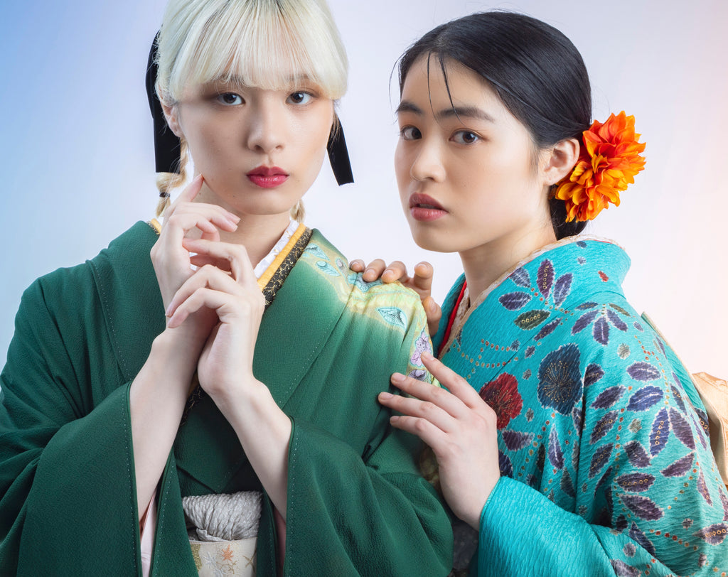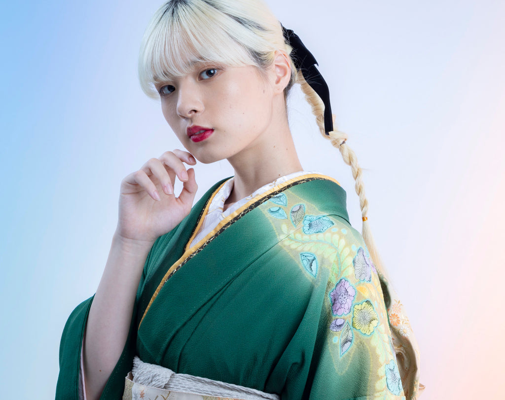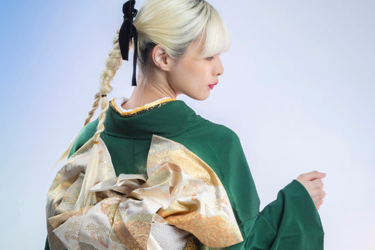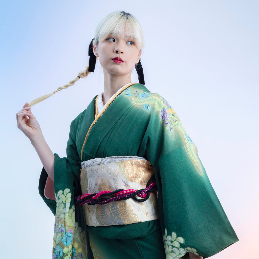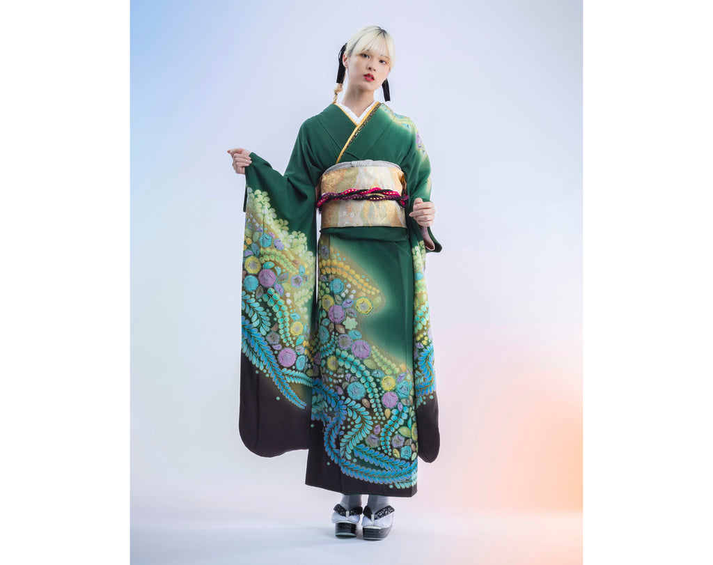 深緑に虹色のような花と葉の模様が広がっていて、 まるで幻想的な森の中を思わせるよう な美しさ、 華やかでありながら落ち着いた品格もあります