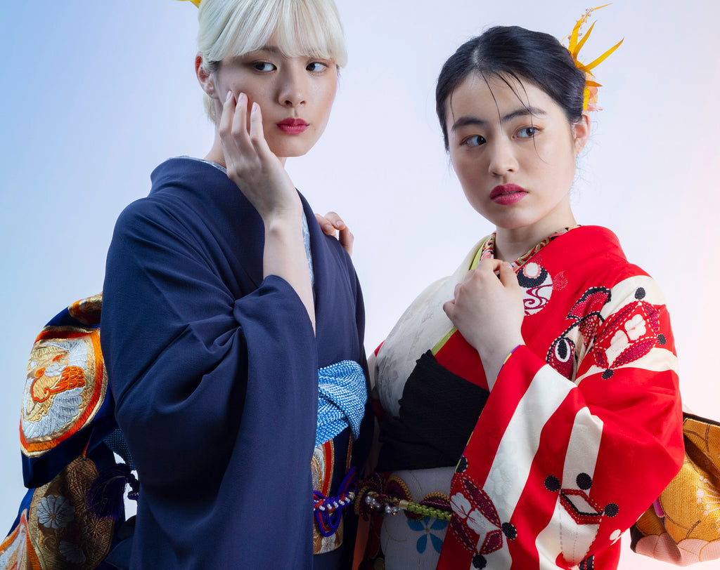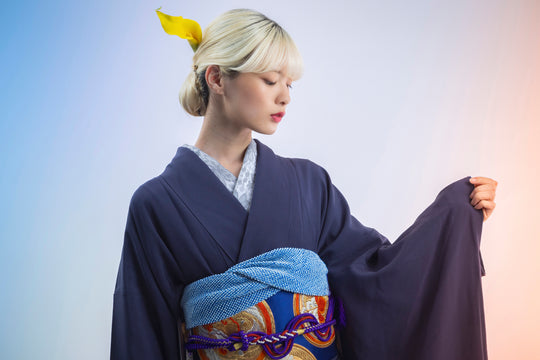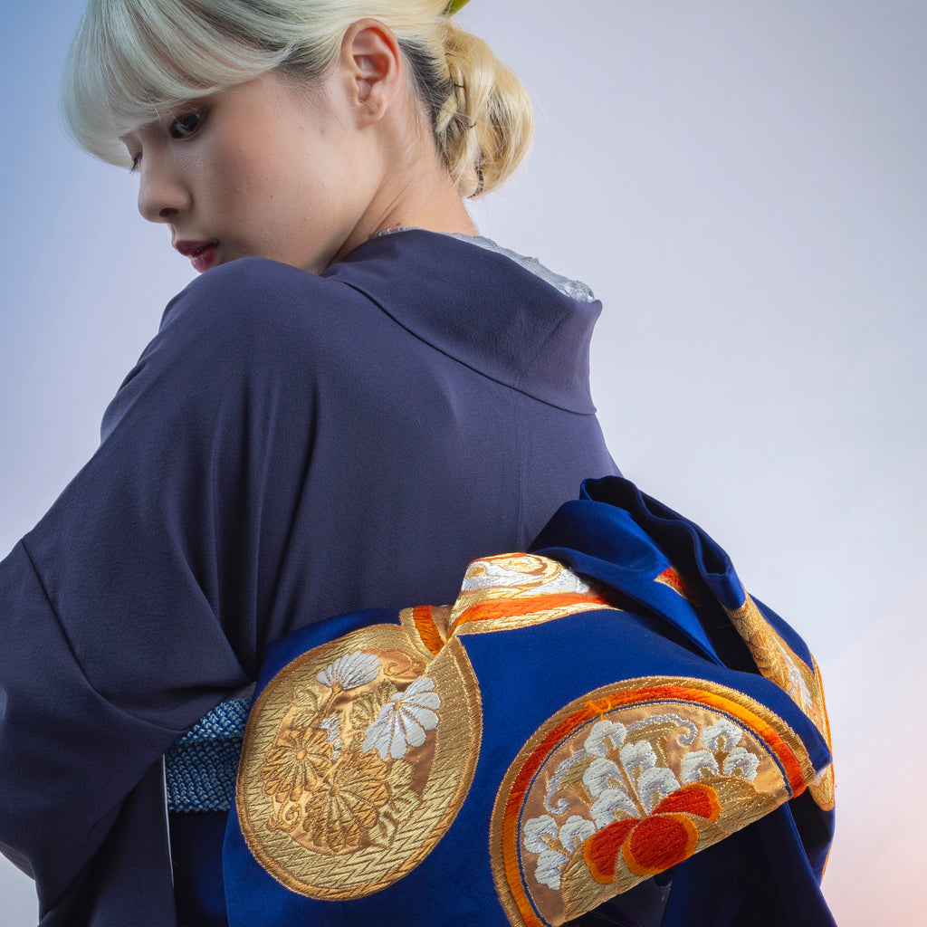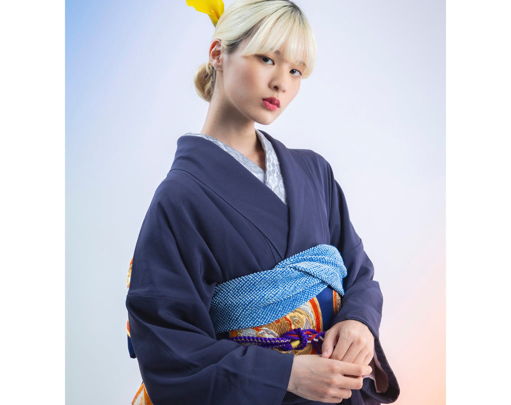 深い紫紺の無地に非常にインパクトのある帯を合わせた静謐な強さと気品を兼ね備えた一枚
